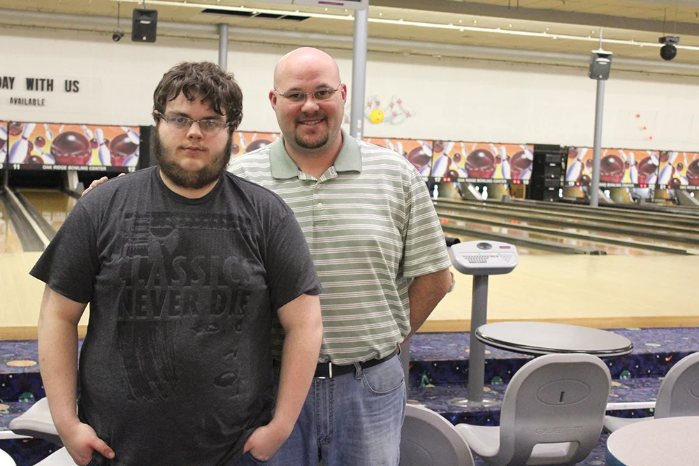 Tristan Cox with manager Craig Porter at Tristan's new job at the Oak Ridge Bowling Center.
