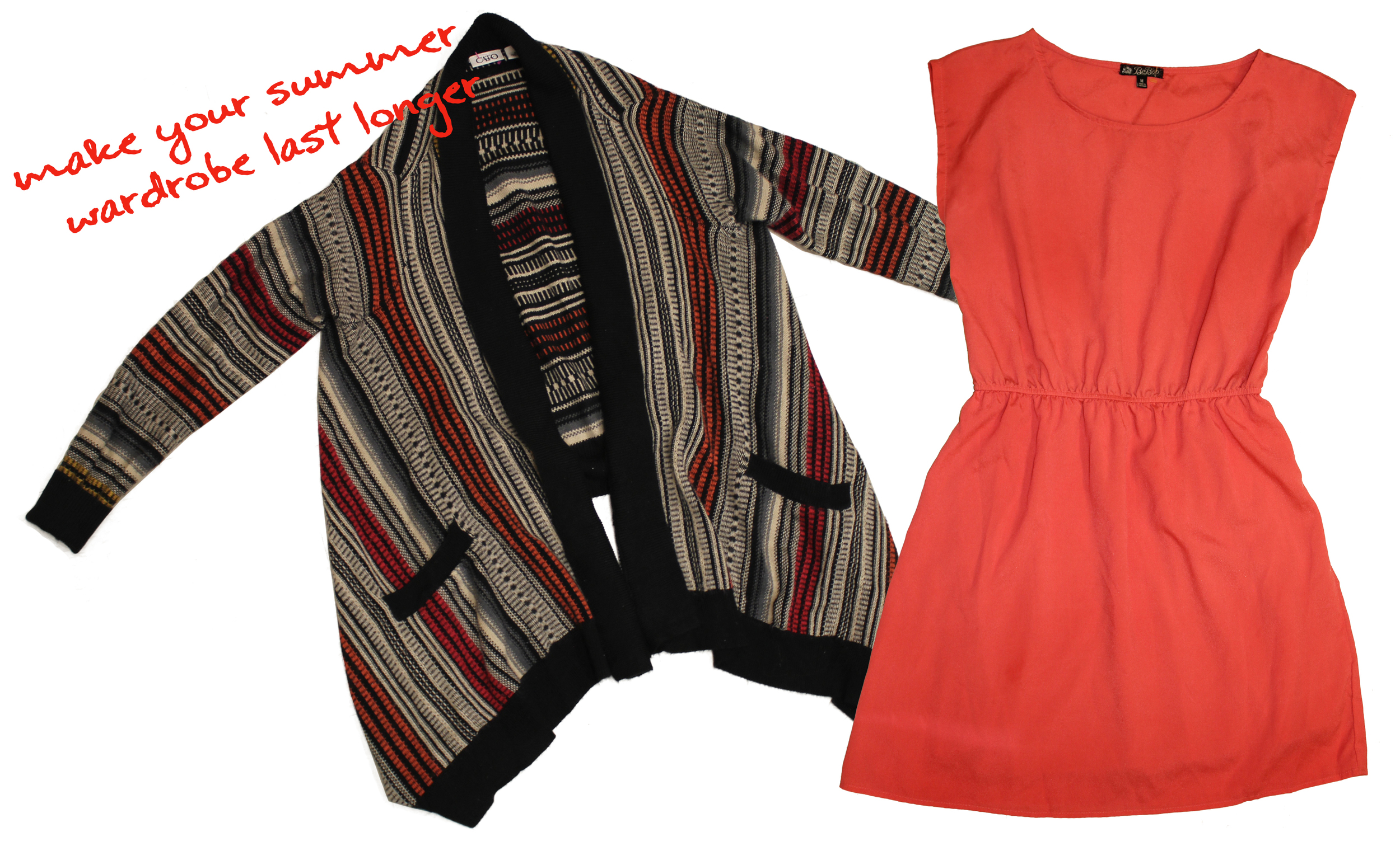 First I picked out this pink dress that coordinates with the stripes on the sweater. This is a sleeveless dress, and pairing it with a sweater would help you extend the life of a favorite summer piece.