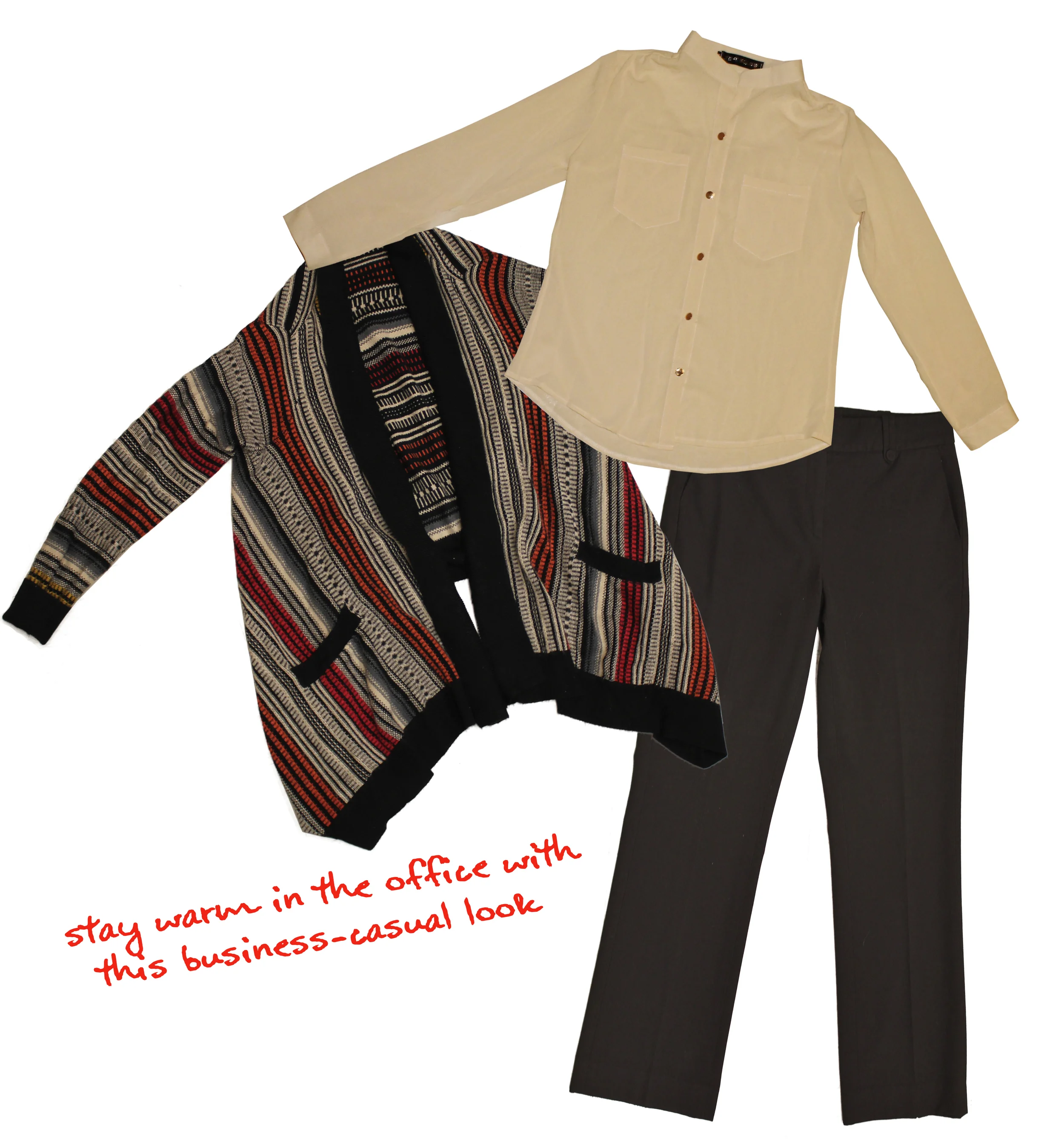 My final outfit is to spice up a professional wardrobe. Assuming you don’t need to wear suits to your office every day, the work place is an awesome place to mix in your new pieces. I paired this sweater with a basic pair of black pants from Talbots and an off white button down shirt. I love this look, and it has given me new ideas of what I could wear in the office in the next couple of months.