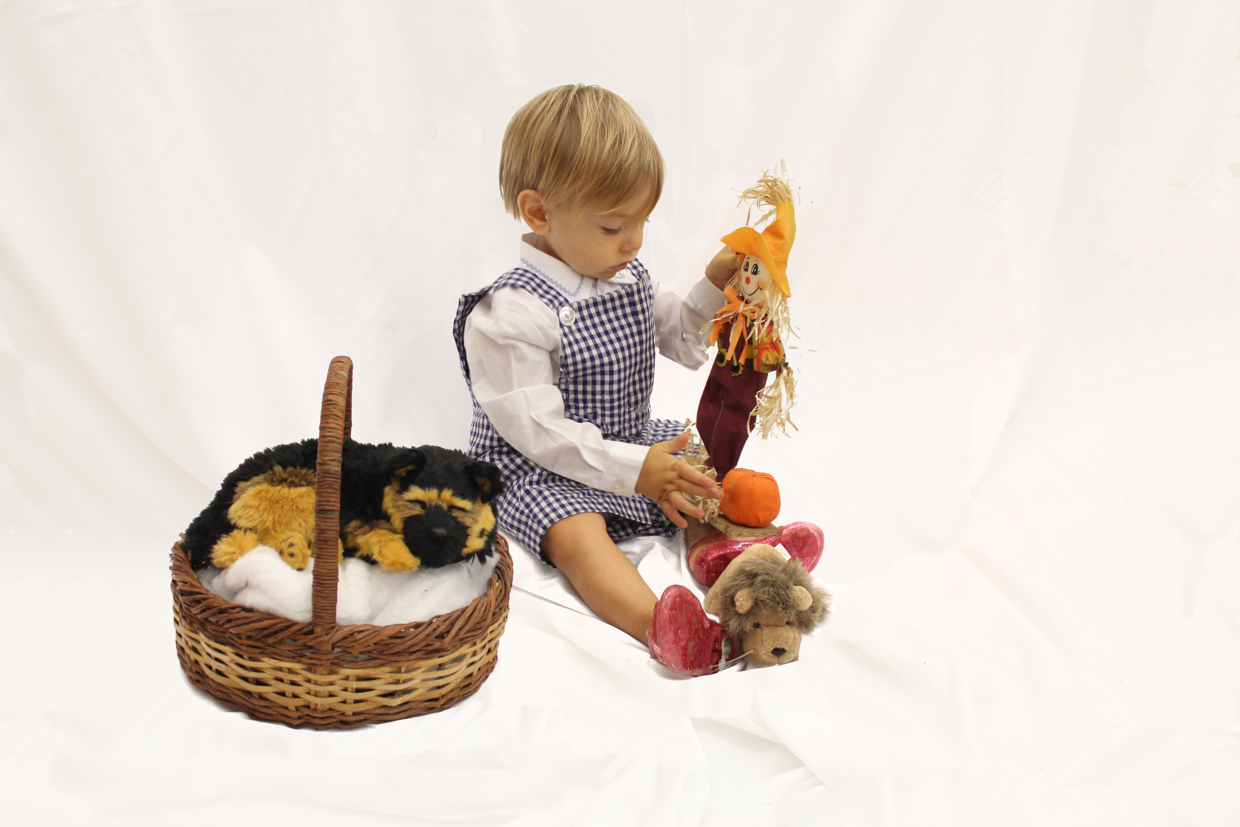 You could also find a white shirt, a blue dress, and some red shoes, and you child can be a little Dorothy. We picked out a Toto in a basket, a scarecrow, and a cowardly lion so our little Dorothy would make it safely to the Wizard of Oz.