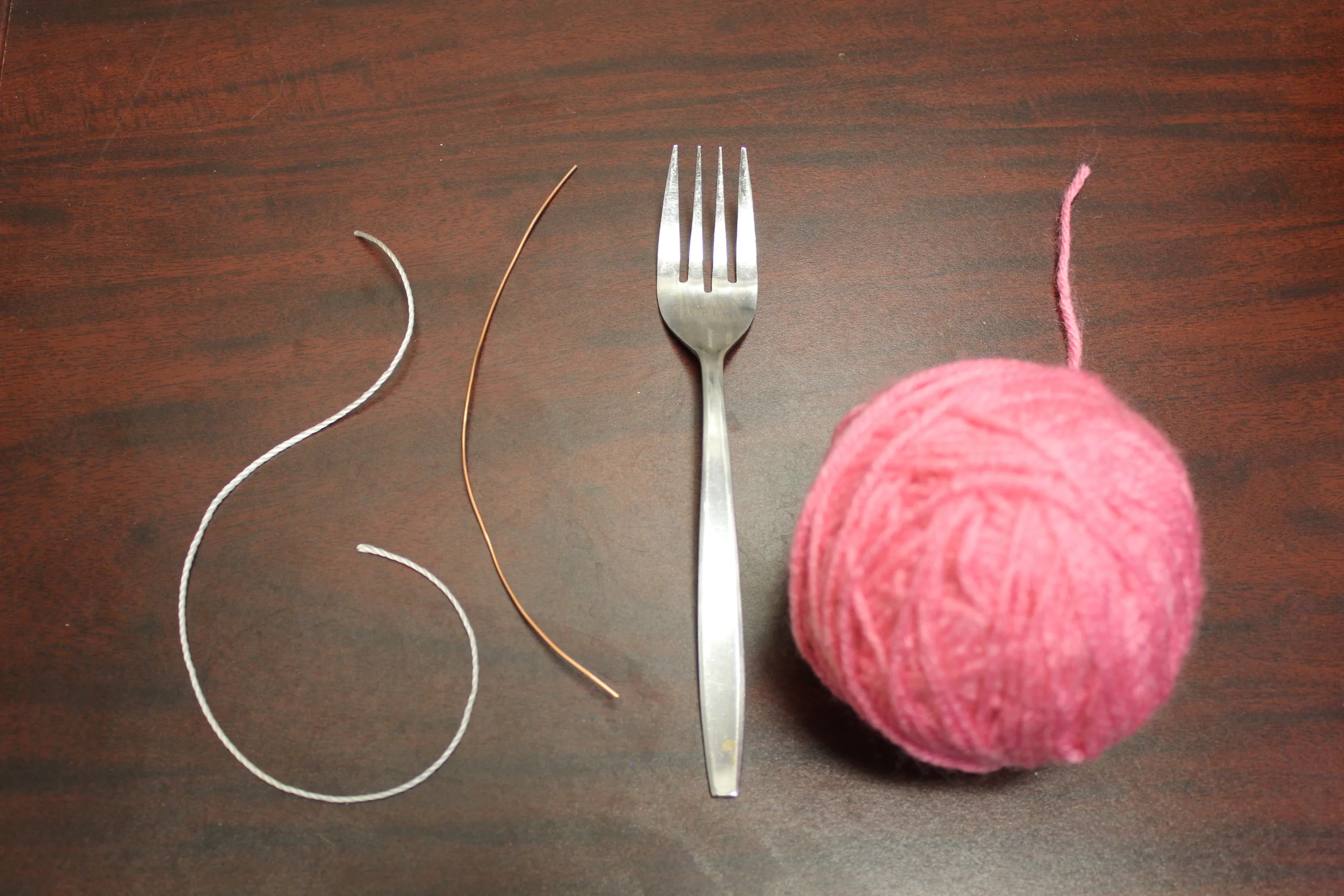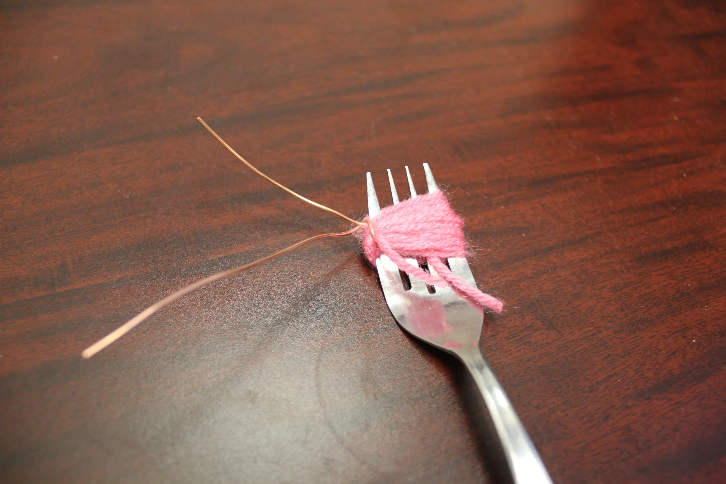 Hold the wire and the fork in the same hand and wrap the yarn around them. This may be a little tricky to start, but once you get the yarn looped around a few times, everything will hold together. Wrap the yarn around the fork tines about 12 times - it doesn't have to be tight. When you're done wrapping, make sure your wire is positioned at the edge of the fork.