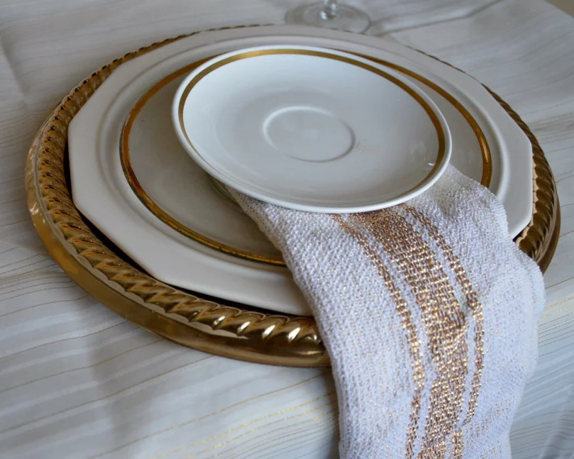 I’ve been obsessed with gold lately and these gold-rimmed plates, napkin, tablecloth and charger go together perfectly because they have all follow the same color scheme.