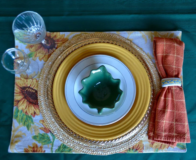 One small detail you might not have noticed for this place setting is how I doubled the placemats. I put the rounded mat on top of the square Sunflower placemat to enhance the layering effect of the gold charger.
